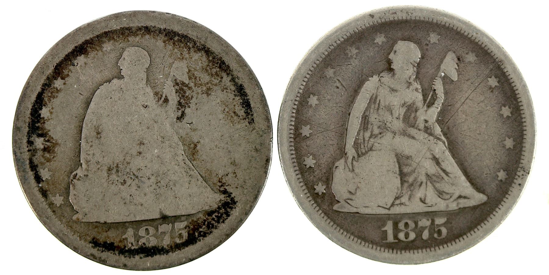 Two 1875-S Seated liberty twenty cent pieces, one AG/G, the other G-VG condition. A short lived coin series, often confused with quarter dollars.