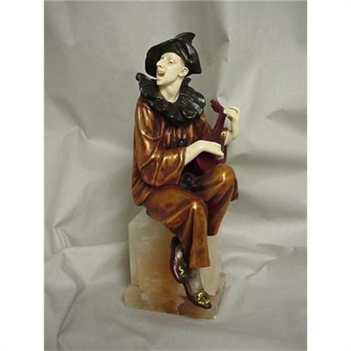 "Seated Mandolyn Player" Can't you just hear the sound of this entertaining player coming out of his expressive ivorine face. He is made of acrylic material and is finished in both hand painted and polished pewter for a most decorative and charming accent to any space. His solid marble base is 4 1/2 by 3 inches.
