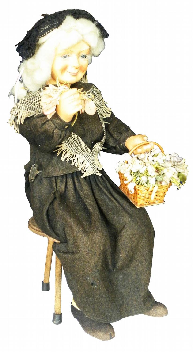 Seated Old Woman Automaton, arms, eyes and head moves. Composition head and glass eyes. Very good original condition. 26 inches tall w/stool.
