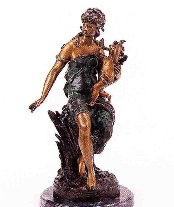 "Seated Woman With Cupid" Bronze Sculpture - After A. Moreau - Beautiful Color Patina Finish - Mounted On Fine Italian Marble Base - Signed - Mint Condition - 26"H X 11"W - Lost Wax Cast Bronze