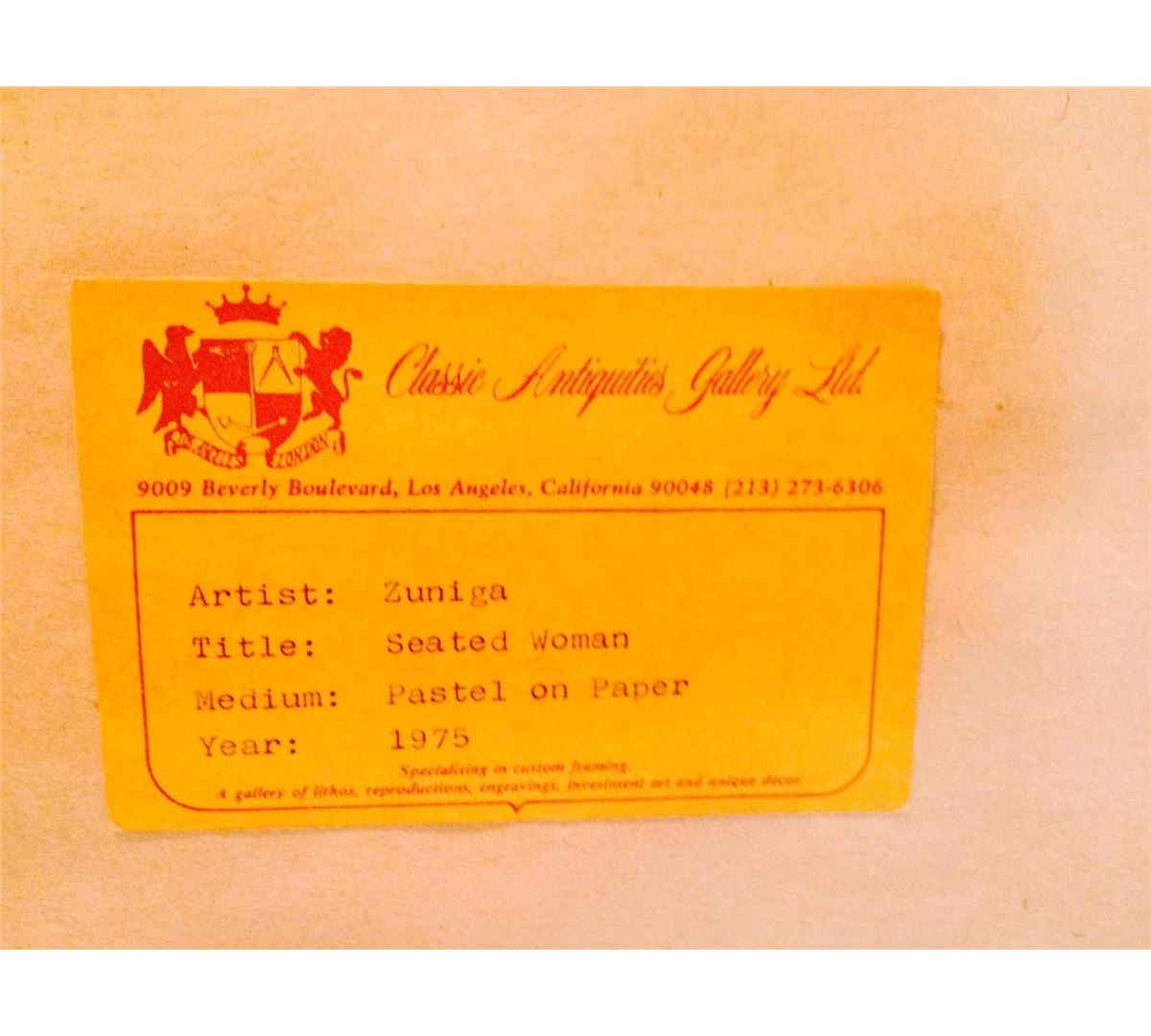 Francisco Zuniga, a Costa Rican-born Mexican artist, was known for his paintings and sculptures. Some have considered him to be one of the 100 most notable Mexicans of the 20th century. This piece only solidifies such statements. "Seated Woman" by Zuniga comes framed and ready to hang! Medium: Pastel on paper. Image dimensions: 19" x 26". Framed dimensions: 29" x 36".