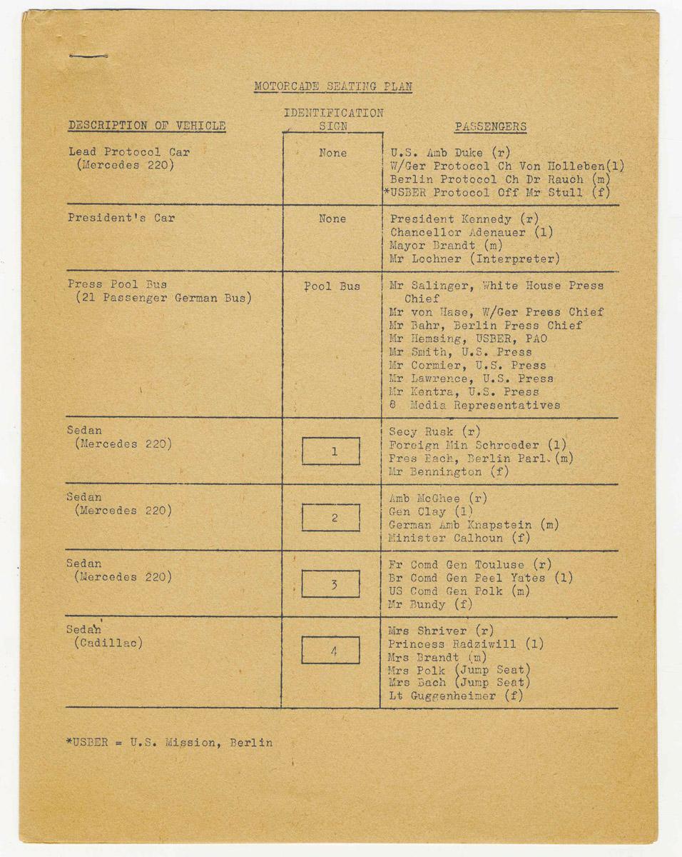 Original motorcade seating plan for President John F. Kennedy's 1963 trip to Berlin, Germany. ''The President's Car'' is listed as having no identification sign and where JFK, West Berlin Mayor Willy Brandt and West German Chancellor Konrad Adenauer would sit. The trip became famous for JFK's speech in West Berlin condemning Communism and the Berlin Wall. Three page document measures 8'' x 10.5''. Near fine condition.