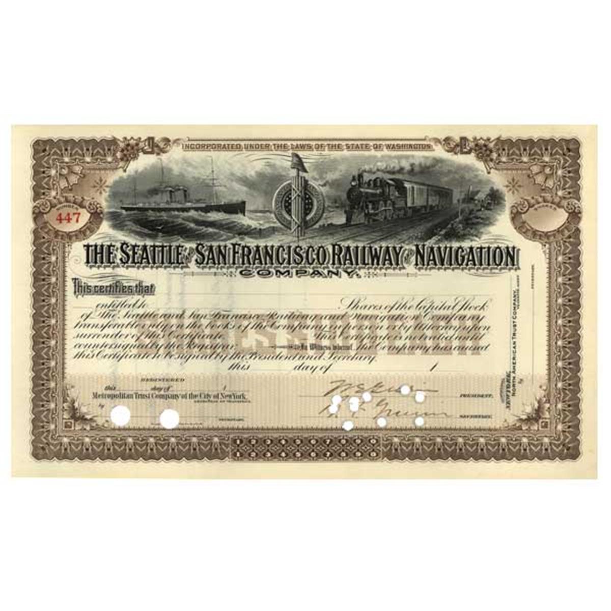 Washington. Unissued stock certificate. Brown/Black. Gorgeous vignette along the top of the certificate depicting a steamship at left of center and a steam locomotive at right. Engraved. Uncancelled and Excellent.