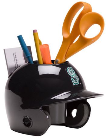 Schutt Sports MLB Licensed Mini Batting Helmet Desk Caddy in the Seattle Mariners logo. Genuine batter’s helmet scaled down to 1/4 size. Hard durable helmet shell. Perfect for the home or work office, this attention-grabbing desk ornament leaves no doubt to guests and business acquaintances who's your team. Fill it with business cards and team-colored pens, but be prepared to talk Mariners baseball when people roll in.