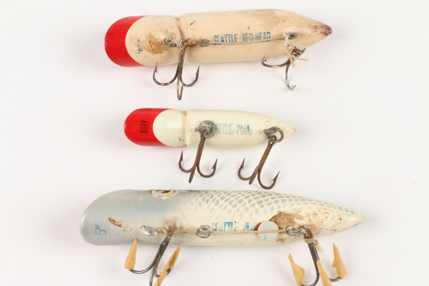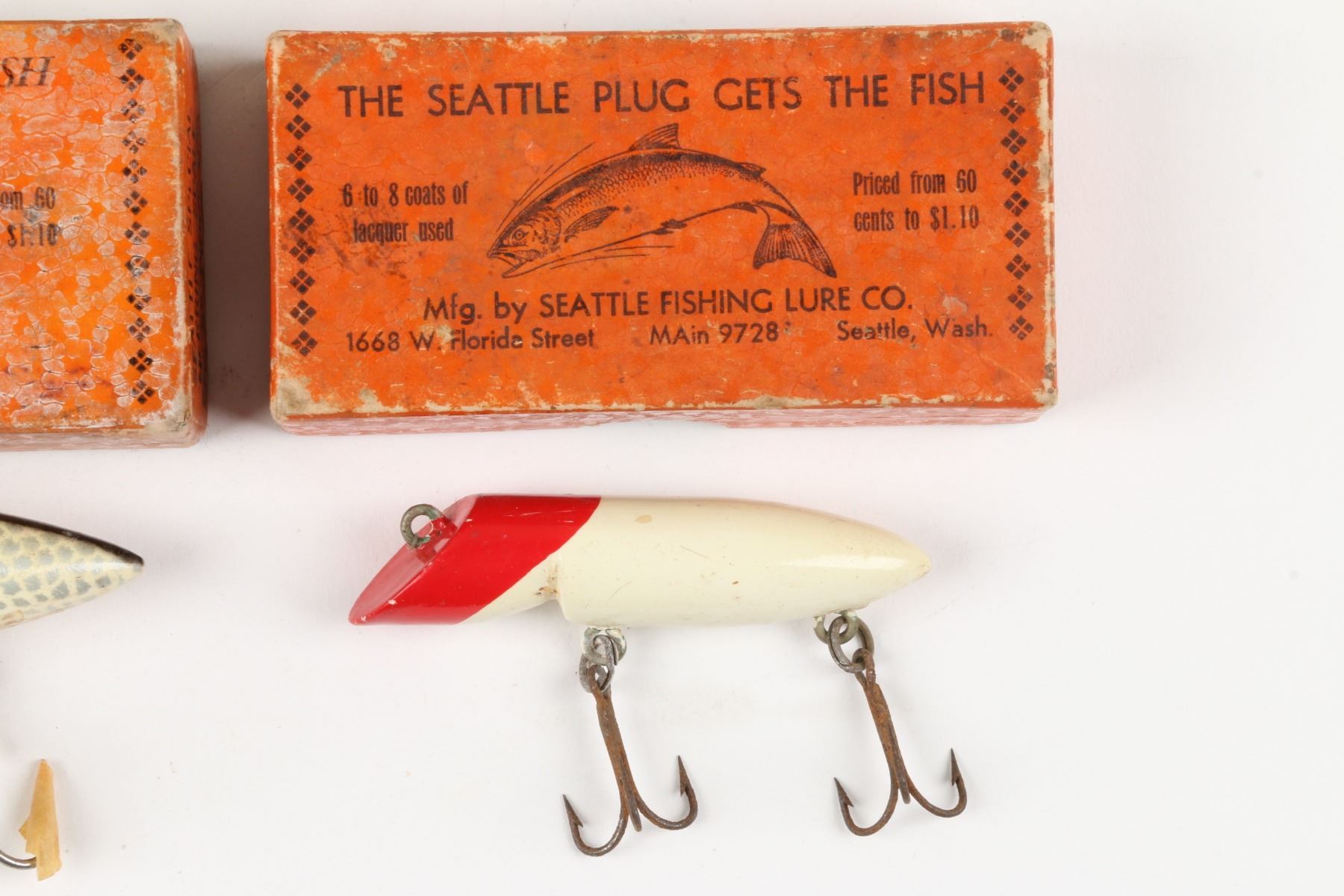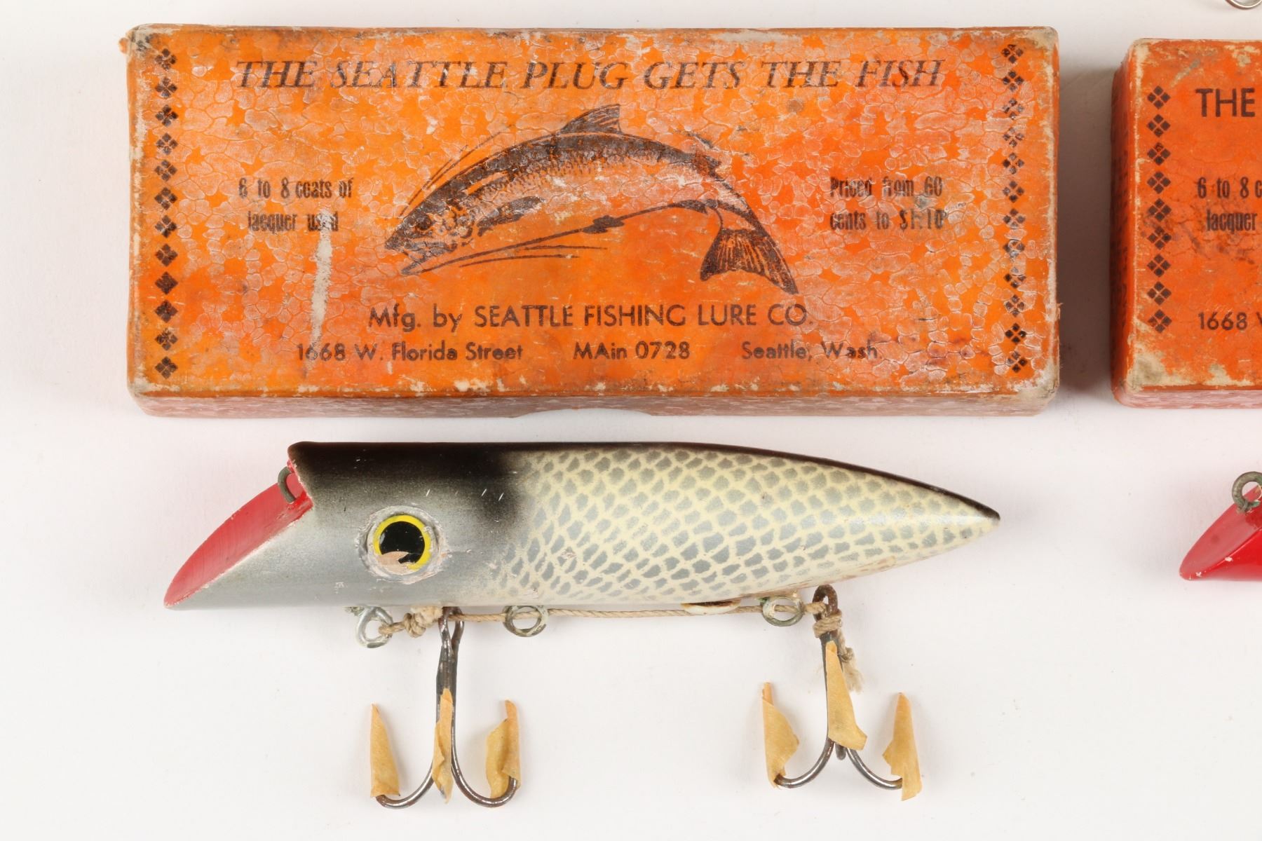 Seattle Fishing Lure. Co., United States. 2 Boxed. Material: Wood. Quantity: 3. Grade: G. 4.25" - 5.5" boxes. Est. $75-100.