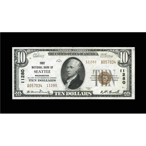 <B>Seattle, WA</B></I> - $10 1929 Ty. 2 <B>First NB</B></I> Ch. # 11280<BR>Embossing, natural paper wave, and original sheen are noticed on this nicely margined $10. <B>Gem Crisp Uncirculated.</B></I>