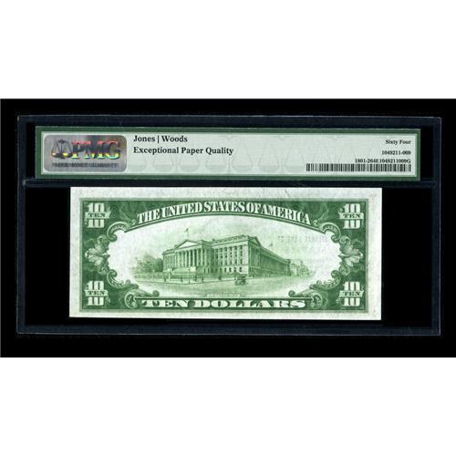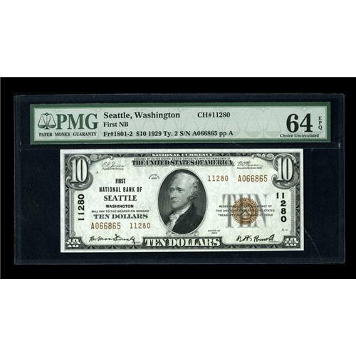 <B>Seattle, WA</B></I> - $10 1929 Ty. 2 <B>First NB</B></I> Ch. # 11280<BR>Embossing, natural paper wave, and original sheen are noticed on this nicely margined $10 graded <B>PMG Choice Uncirculated 64 EPQ.</B></I><BR><BR><b>Shipping:</b> Coins & Currency (<a target="_blank" href="http://www.heritageauctions.com/common/shipping.php">view shipping information</a>)