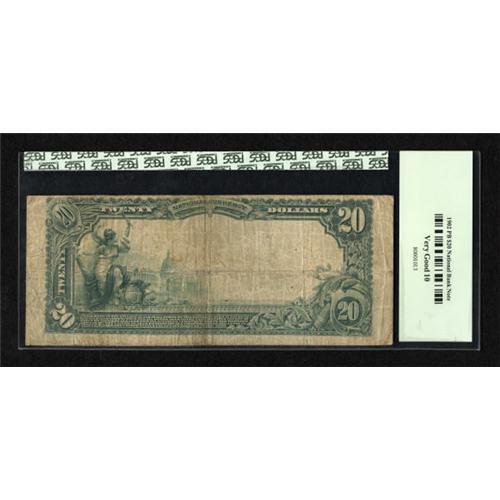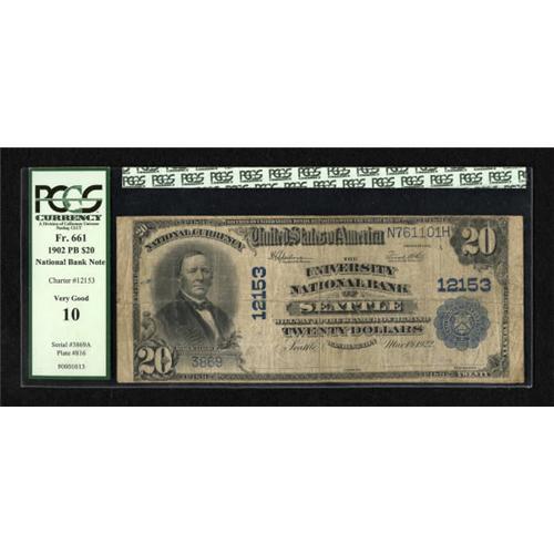 <B>Seattle, WA</B></I> - $20 1902 Plain Back Fr. 661 <B>The University NB</B></I> Ch. # 12153<BR> The last appearance of this issuer's notes at major auction was in 2005, which is the last time this piece traded hands. This note is attractive and appears fully Fine with a single pinhole. <B>PCGS Very Good 10.</B></I><BR><BR><b>Shipping:</b> Coins & Currency (<a target="_blank" href="http://www.heritageauctions.com/common/shipping.php">view shipping information</a>)