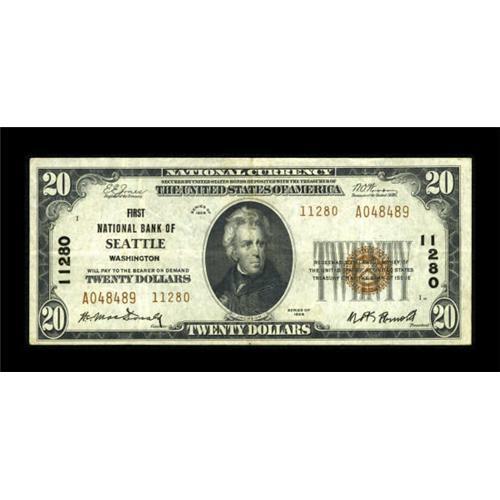 <B>Seattle, WA</B></I> - $20 1929 Ty. 2 <B>First NB</B></I> Ch. # 11280<BR> This bank issued nationals under four different titles, with three titles being used on the small size nationals alone. Collecting different bank titles on the same charter number can be challenging and rewarding at the same time.<B> Very Fine+. </B></I><BR><BR><b>Shipping:</b> Coins & Currency (<a target="_blank" href="http://www.heritageauctions.com/common/shipping.php">view shipping information</a>)