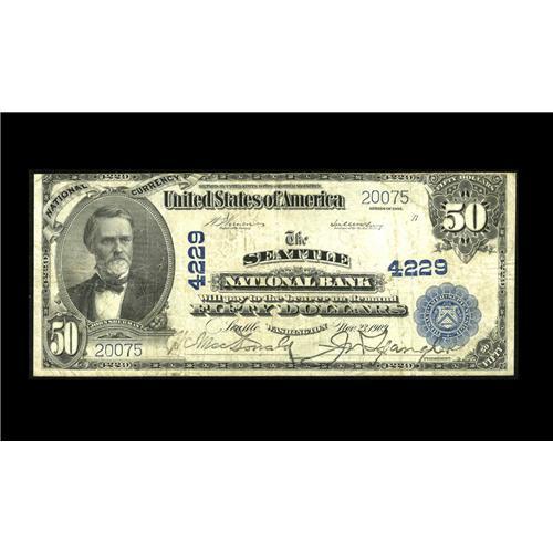 <B>Seattle, WA</B></I> - $50 1902 Date Back Fr. 670 <B>The Seattle NB</B></I> Ch. # 4229<BR>An attractive high denomination example which is perfect as a representative of this increasingly elusive type. <B>Very Fine.</B></I>