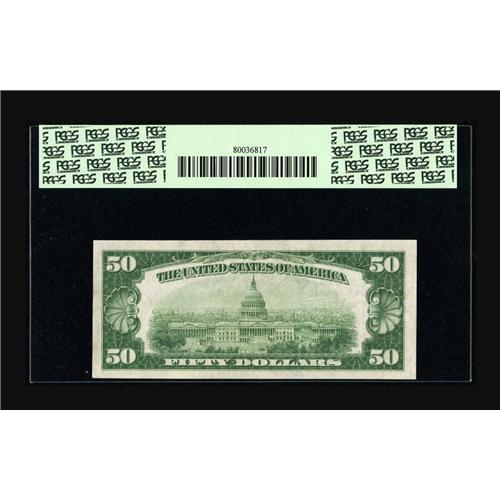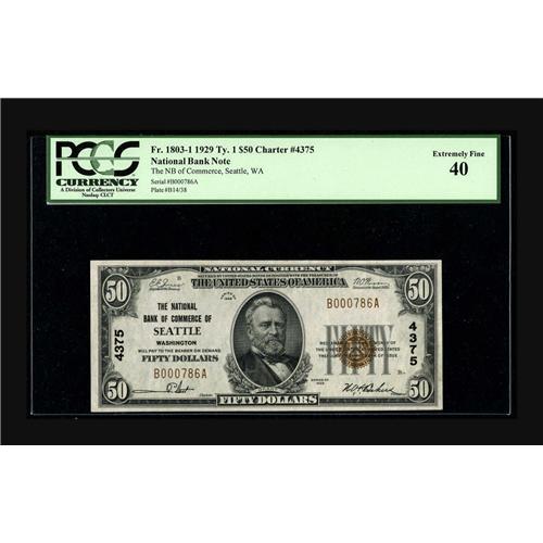 <B>Seattle, WA</B></I> - $50 1929 Ty. 1 <B>The NB of Commerce</B></I> Ch. # 4375<BR><B>PCGS Extremely Fine 40</B></I> and from the standpoint of overall visual appeal certainly one of the nicest notes extant to bear the EF grade. Bright, well centered and with just a single fold detectable through the encapsulation surfaces, this is quite simply just a really nice looking example of its type and denomination that will please all but the marginally deranged.<BR><BR><b>Shipping:</b> Coin/Currency (<a target="_blank" href="http://www.heritageauctions.com/common/shipping.php">view shipping information</a>)