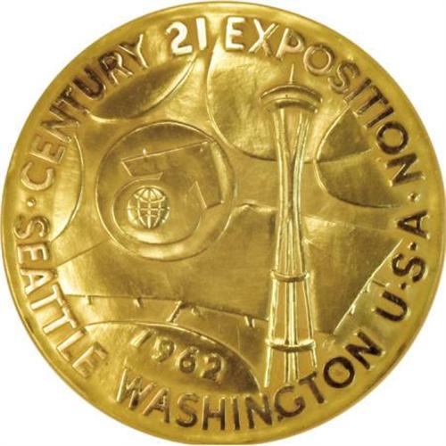 <B>Seattle World's Fair Complete 20-Piece Gold & Silver Sets.</B></I> DESIGN: Please pick up photos from Sale 422, lot 3906, 12 photos plus ONE NEW LARGE SILVER MEDAL, 13 total. <BR><BR>The gold set consists of one large (64-mm, 192.5-gm) gold medal, eight medium (38-mm, 36.5-gm) gold medals, and one small (33.5-mm, 22.1-gm) medal, each struck in 14-kt gold. The very large gold medal and smallest medal were struck at the U.S. Mint, while the eight medium medals were struck by the Metal Arts Co. of Rochester, New York. The two medals produced by the U.S. Mint were designed by George Tsutakawa. It was believed that just four of these gold sets were produced, with one of the four reportedly held by the Smithsonian Institution. Based upon new information our consignor provided, we know that only four complete gold sets were indeed produced, for presentation only and not to be sold, according to a July 12, 1962, letter from Ms. Eva Adams, Mint director. <BR> Also included is a matching silver set, identical in design and size to the gold medals. The small and medium silver medals are housed in a Whitman blue coin album, while the large gold medal is in a hard Capital plastic holder and the large silver is in a cardboard box.<BR> Each of the eight medium gold medals have a common reverse design featuring the Century 21 Exposition logo and the inscription SEATTLE WORLD'S FAIR OFFICIAL MEDAL with the 1962 date.<BR><B>Space Needle.</B></I> Inscribed SPACE NEEDLE, WORLD'S LARGEST REVOLVING RESTAURANT 600 FEET IN THE SKY.<BR><B>Monorail. </B></I>Inscribed MONORAIL. THE WORLD'S FIRST HIGH-SPEED MASS TRANSIT MONORAIL.<BR><B>Million Dollar Display.</B></I> Inscribed 30 TONS OF SILVER DOLLARS PRESENTED BY BEHLEN OF COLUMBUS, NEBRASKA.<BR><B>World of Science. </B></I> Inscribed WORLD OF SCIENCE USE DEVELOPMENT SPACEARIUM METHODS & HORIZONS OF SCIENCE.<BR><B>World of Century 21. </B></I>Inscribed WORKING, LIVING, PLAYING, TRAVELING, LEARNING IN CENTURY 21.<BR><B>World of Commerce and Industry. </B></I>Inscribed WORLD OF COMMERCE AND INDUSTRY. THE GATEWAY TO TOMORROW'S LIVING PREVIEWED TODAY.<BR><B>World of Entertainment.</B></I> Inscribed THE MERRY GO ROUND OF FUN AND LAUGHTER PAST, PRESENT & FUTURE.<BR><B>World of Art. </B></I>Inscribed WORLD OF ART, MUSEUM MASTERPIECES, PAINTINGS & SCULPTURE SINCE 1950. NORTH-WEST COAST INDIAN ART.<BR><B>Century 21 Expositions.</B></I> 33.5 mm. The obverse and reverse are identical to the large 64-mm medal.<BR><B><BR>Silver matching set.</B></I> The silver set is identical to the above medals except for the size and weight of the large silver medal, 64.0 mm, 156.4 gm. The size and weight of the medium medals are 40 mm, 30 gm. The small silver medal is 34 mm, 19.4 gm.<BR> We sold a certified gold set in our Platinum Night sale, January 2007, lot 3906, for more than $25,000. <BR> <I>This is an outstanding opportunity to acquire a truly rare set of these gold and silver medals, with likely only two other complete sets in private hands and the possibility that many years may pass before another set is offered.<BR><BR></B></I><B><I><BR></B></I></B></I><BR><BR><b>Shipping:</b> Coins & Currency (<a target="_blank" href="http://www.heritageauctions.com/common/shipping.php">view shipping information</a>)