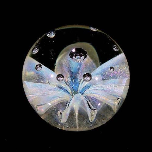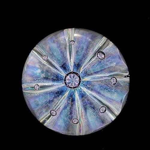 Seaview Art Glass 1998 "Anemone" paperweight, composed of silver veils and spaced bubbles, over clear ground. Signed/dated. Diameter 2 3/4".