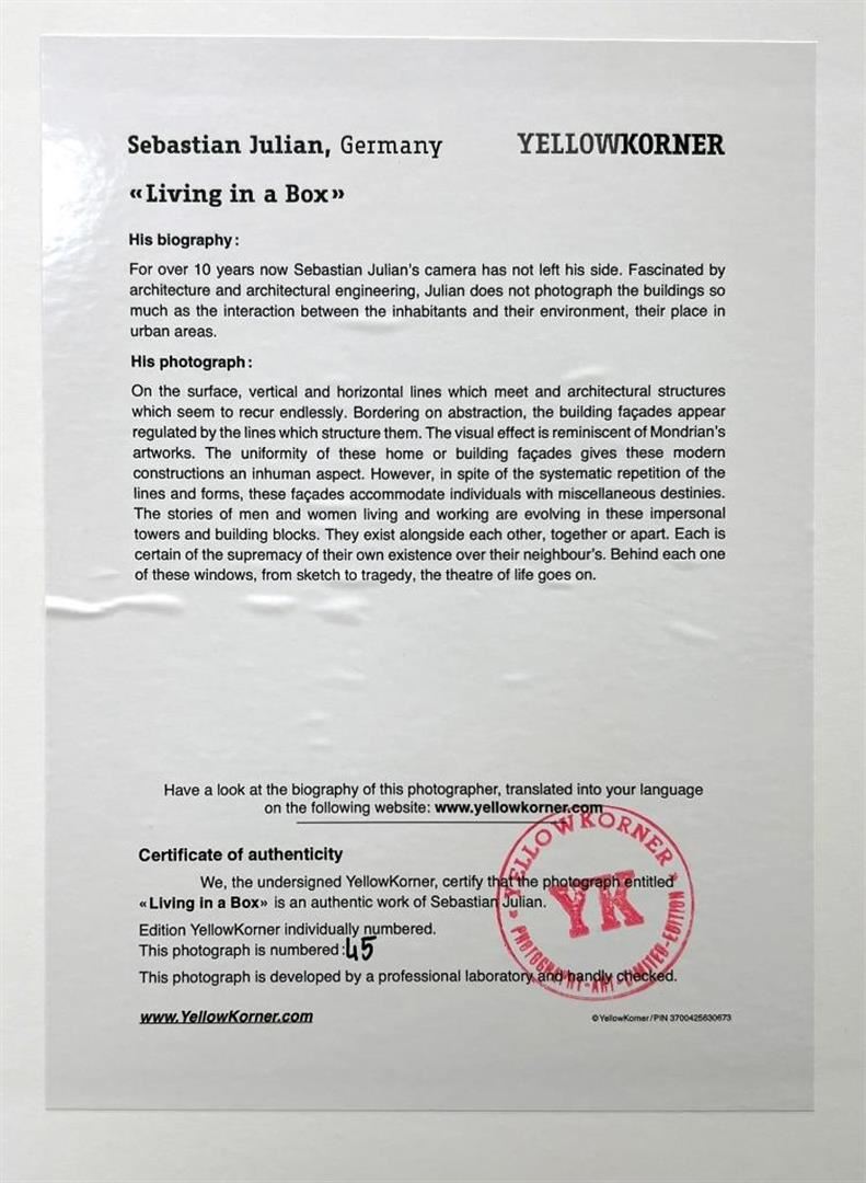 Sebastian Julian Germany Living In a Box YellowKorner Certified Photograph. Certificate of Authenticity from YellowKorner affixed to the back. Matted Dimensions 16"x20". Protected with Clear Mylar Sleeve.
