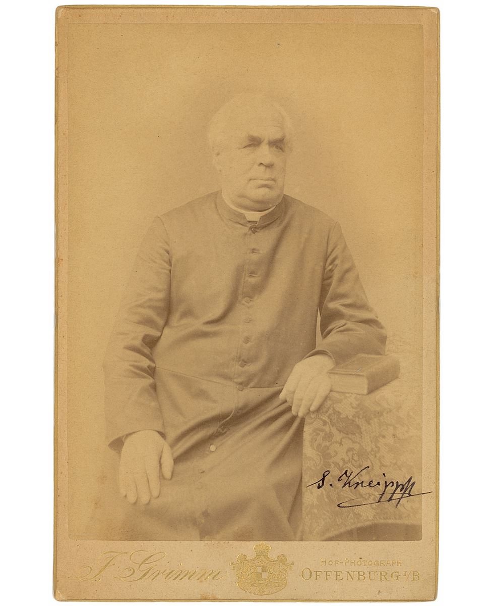 Bavarian priest (1821–1897) who pioneered naturopathic medicine, particularly a form of hydrotherapy known as the Kneipp cure. Appealing 4.25 x 6.5 cabinet three-quarter-length portrait of Kneipp, signed in the lower right in black ink, “S. Kneipp.” Published by Julius Grimm of Offenburg. In fine condition.