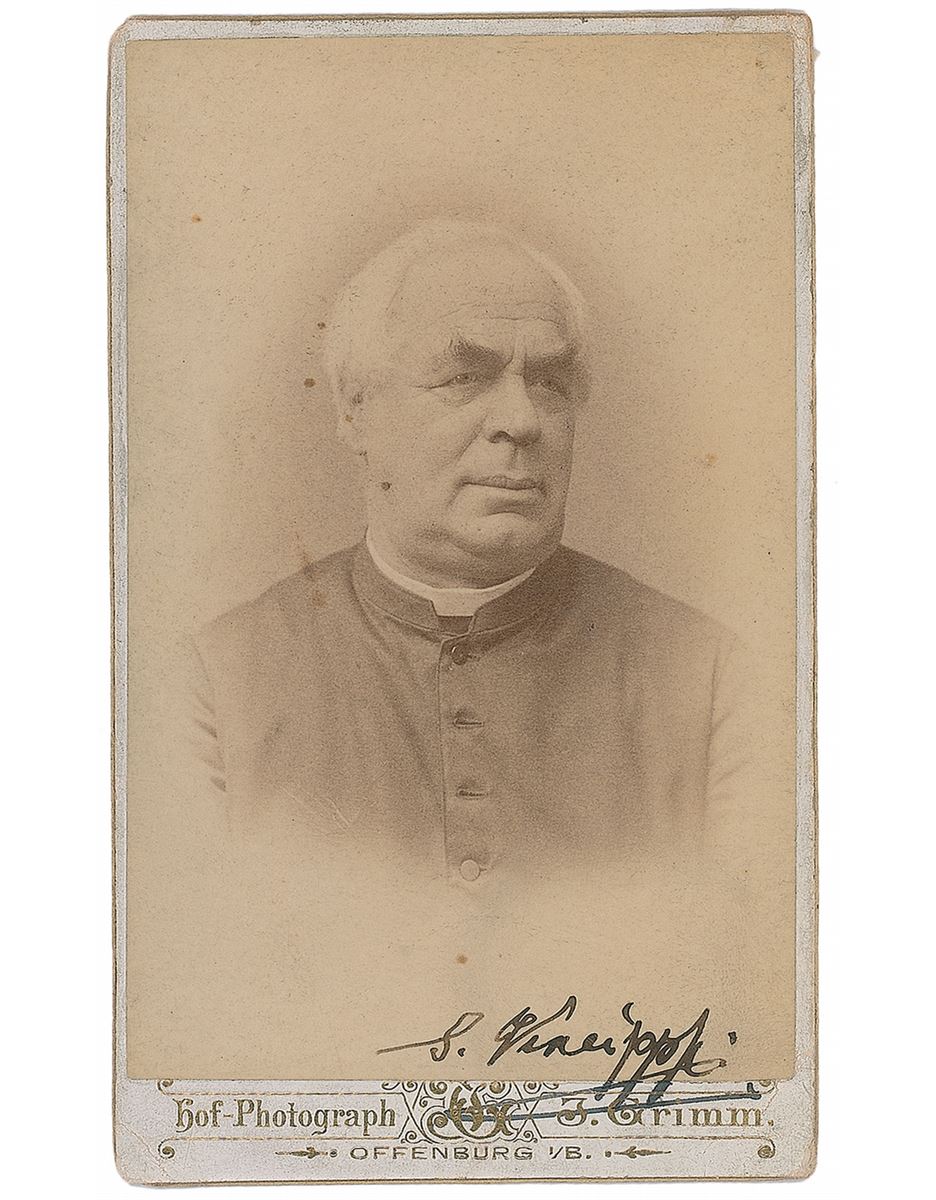Bavarian priest (1821–1897) who pioneered naturopathic medicine, particularly a form of hydrotherapy known as the Kneipp cure. Scarce original 2.5 x 4 carte-de-visite bust portrait of Kneipp, signed at the bottom of the image in black ink, “S. Kneipp.” Published by Julius Grimm of Offenburg. In fine condition, with a few spots to image and light general wear.