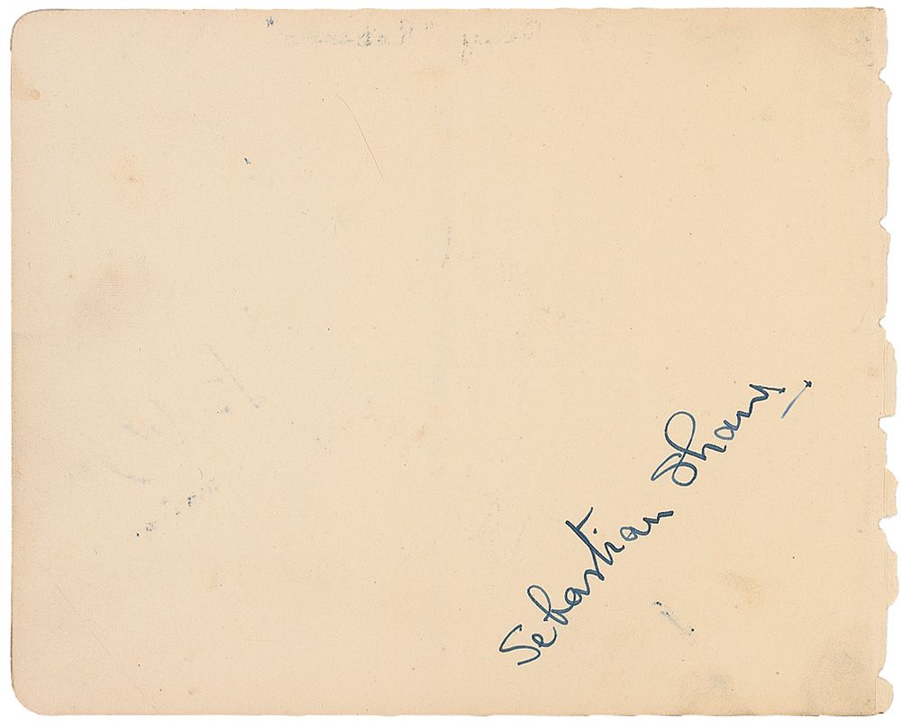 English actor, director, novelist, playwright, and poet (1905–1994) widely known for his Shakespearean roles, though perhaps most famously remembered for his small role as Anakin Skywalker/Darth Vader revealed at the end of Star Wars Return of the Jedi. Vintage fountain pen signature, “Sebastian Shaw,” on an off-white 6.5 x 5.25 album page. In fine condition, with a uniform shade of toning, some scattered soiling, and light mirroring of ink from opposing page in the original album. Accompanied by an unsigned composite photo of Shaw as Darth Vader.