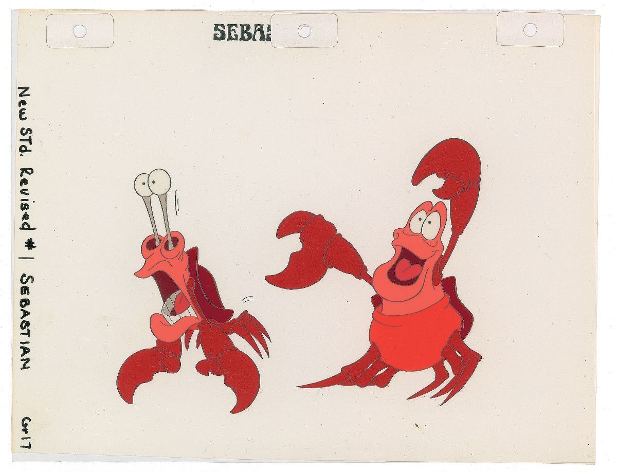 (Walt Disney Studios, 1989) Original color model production cel featuring Sebastian from The Little Mermaid, showing him in two different dramatic poses. Total image measures 7 x 5, with overall dimensions of 11 x 8.5. In fine condition.