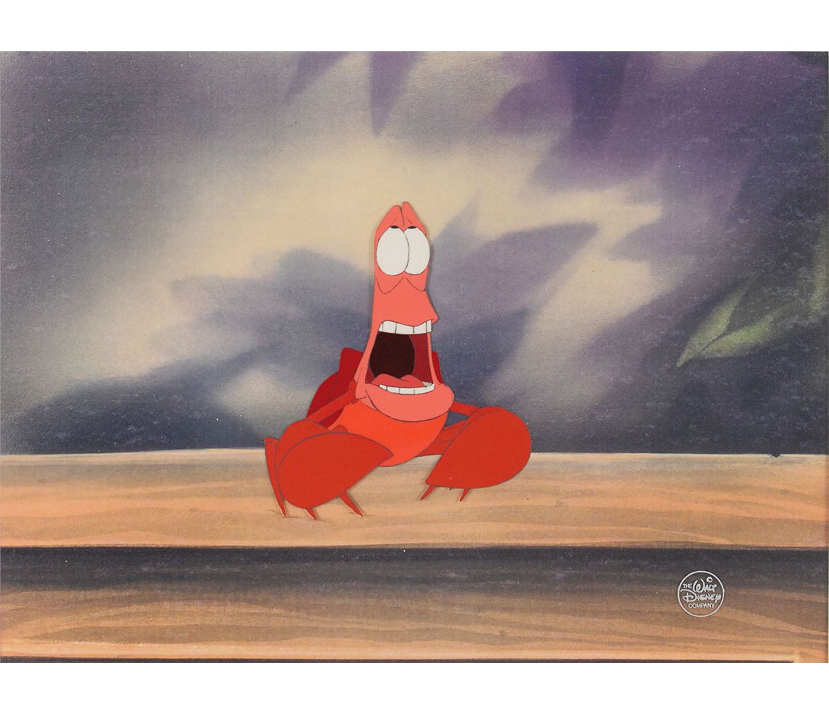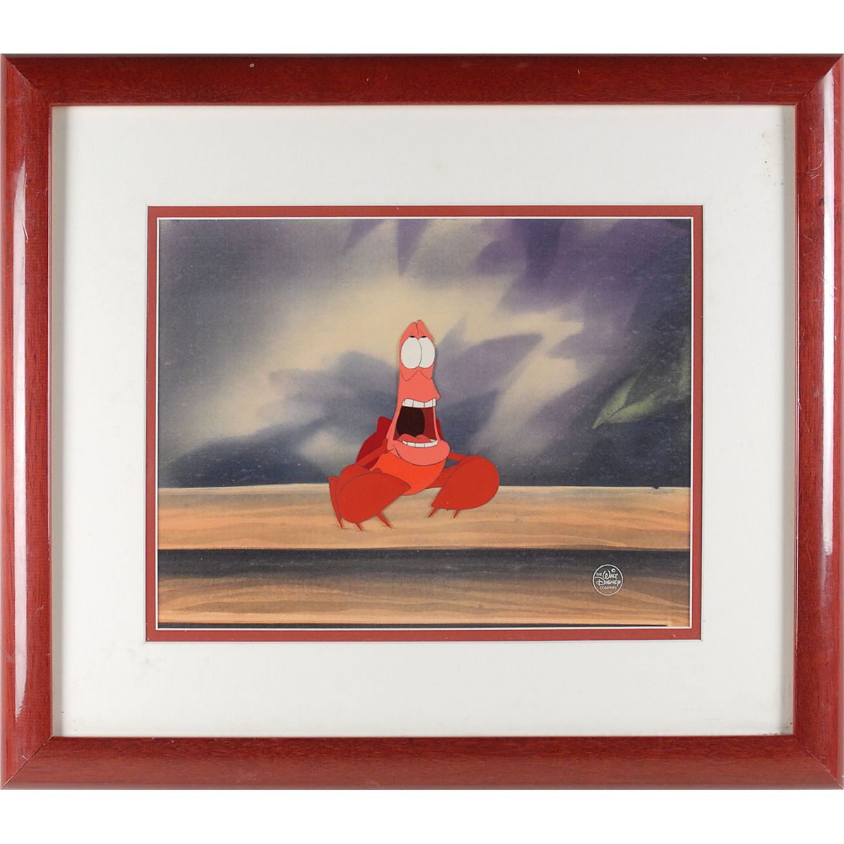 (Walt Disney Studios, 1989) Original production cel featuring Sebastian from The Little Mermaid. The cel is placed on a studio copy background. Image measures 3.75 x 4.5, with a mat opening of 11.75 x 9. This piece is also double-matted and framed to an overall size of 19 x 16. Cel also bears a printed Disney Company seal to lower right. In fine condition.
