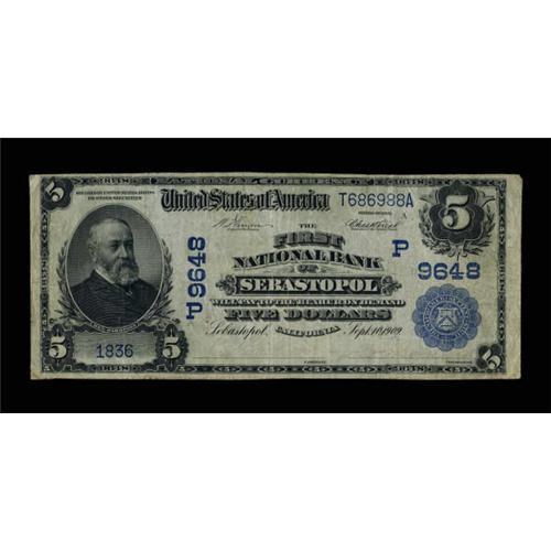 <B>Sebastopol, CA</B></I> - $5 1902 Date Back Fr. 592 <B>The First NB</B></I> Ch. # (P)9648<BR> A great new discovery from this excessively rare Sonoma County bank, by far the scarcer of this small community's two issuers. This is only the second large note recorded from here to date, and comes from a bank which was missing in large size from all of the great California collections sold over the past three decades, including Krakover, Colver, Horwedel, and the Kansas City collection. Evenly circulated <B>Fine, </B></I>a wonderful opportunity for one fortunate California collector to add a new bank in large size. <BR><BR><b>Shipping:</b> Coins & Currency (<a target="_blank" href="http://www.heritageauctions.com/common/shipping.php">view shipping information</a>)