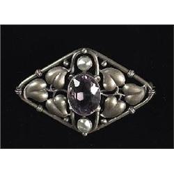 Secessionist brooch, horizontal diamond shape with cut-back leaf design, inset amethyst and abalone, marked, 2.25”w