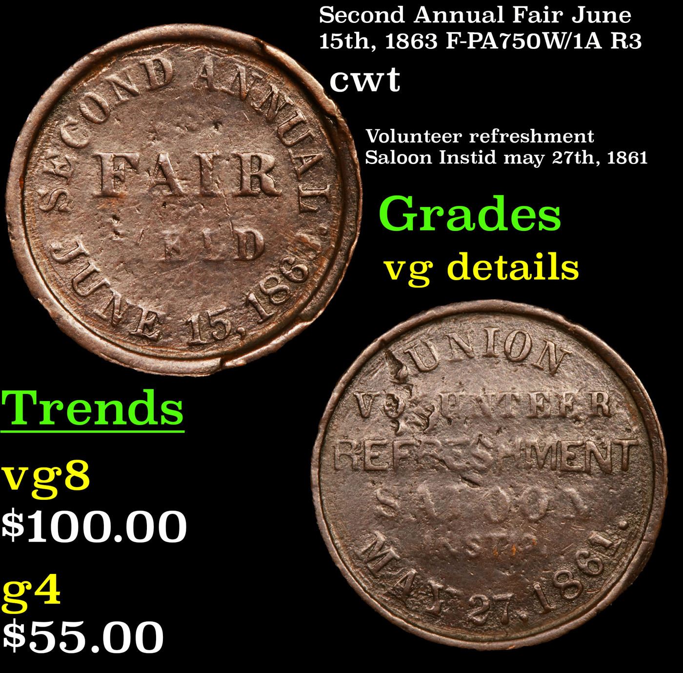Second Annual Fair June 15th, 1863 F-PA750W/1A R3 Civil War Token 1c Grades vg details. Union Volunteer Refreshment Saloon Instituted May 27, 1861. Second Annual Fair Held June 15, 1863. These sanitary fairs were used to raise money to aid soldiers during the war