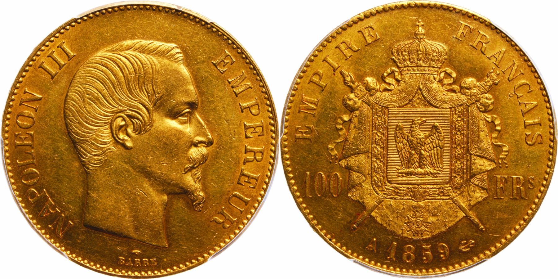 Second Empire 1852-1870 100 Francs, Paris, 1859 A, AU 32.25 g. Ref : G.1135, Fr. 569 Grading : NGC