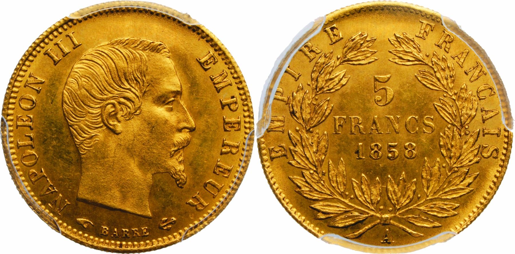 Second Empire 1852-1870 5 Francs, Paris, 1858 A, tranche cannelée, grand module, AU 1.612 g. Ref : G. 1001