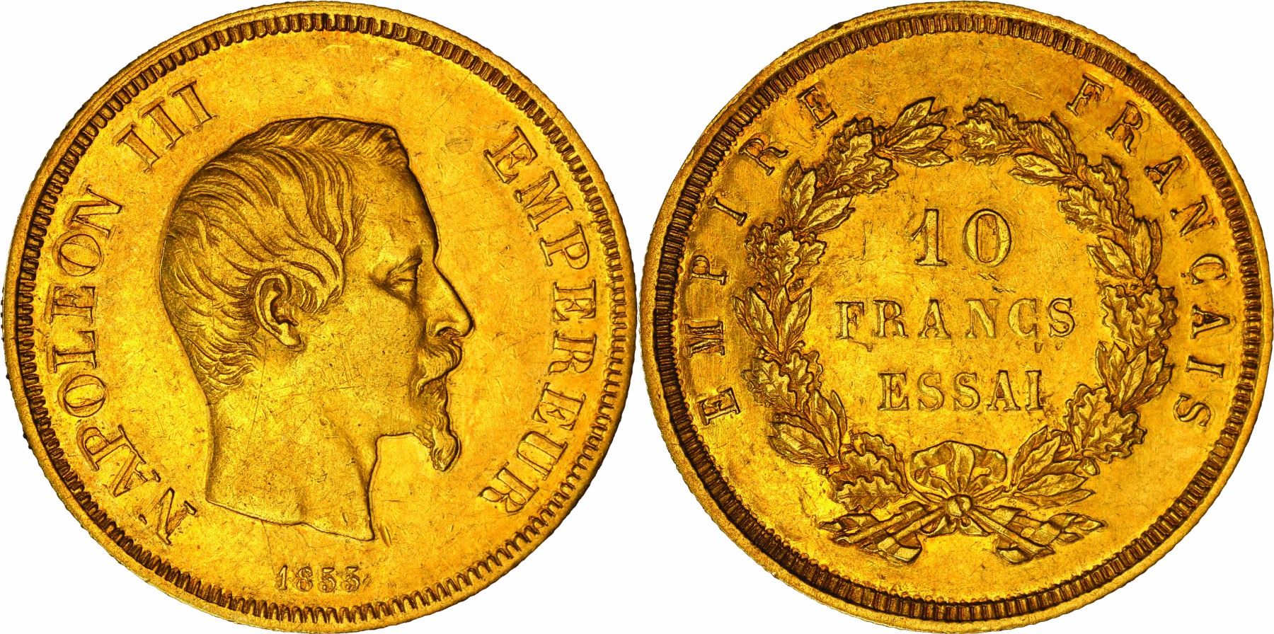 Revers : EMPIRE FRANÇAIS. Dans une couronne formée de deux branches : 10 Francs ESSAI. Ref : G.1014 , Maz.1618a