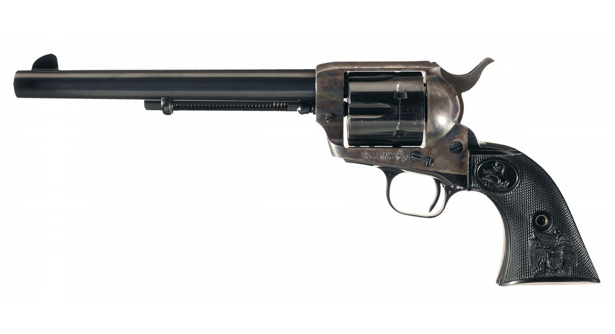 Manufactured in 1973. The top of the replacement barrel has the one line address with "COLT SINGLE ACTION ARMY .45" on right side. Frame has the three line, three patent dates with the Rampant Colt. Matching serial number on frame and left side of the grip straps under the grip with matching assembly number "436" on right rear of the frame and loading gate. Fitted with checkered Rampant Colt/American eagle relief grips numbered to the gun (640).