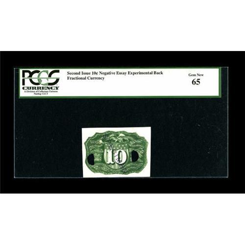 <B>Second Issue 10¢ Negative Essay Experimental Back PCGS Gem New 65.</B></I> Printed in extremely deep green ink, which allows the Negative features to be seen with great clarity. It is punched and stamped as are most all of these Developmental Experimentals. It is printed on paper that has just a very few scattered fibers. <BR><BR><b>Shipping:</b> Coins & Currency (<a target="_blank" href="http://www.heritageauctions.com/common/shipping.php">view shipping information</a>)