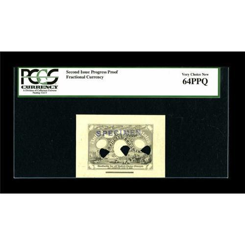 <B>Second Issue Progress Proof PCGS Very Choice New 64PPQ.</B></I> Milton 2E5F.2e would be the closest number for this beautiful high grade Progress Proof. It is very similar to lot 16377 of the Tom O'Mara sale. That piece has previously been lot 890 from our January 1997 sale of the Milt Friedberg Collection. This piece lacks the pasted-on Washington portrait, and is cancelled with three pie-wedge-shaped holes rather than the normal half-moon cancels. A wonderful example with the additional benefit of a very high third party grade--something that few Progress Proofs will ever retain, as most are handled, glue stained, or otherwise impaired. <BR><BR><b>Shipping:</b> Coins & Currency (<a target="_blank" href="http://www.heritageauctions.com/common/shipping.php">view shipping information</a>)