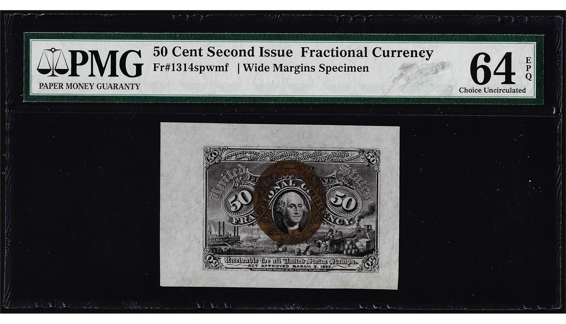 One Second Issue Specimen 50 Cent Fractional Note Fr.1314spwmf PMG Ch. Uncirculated 64EPQ. PMG Certified.