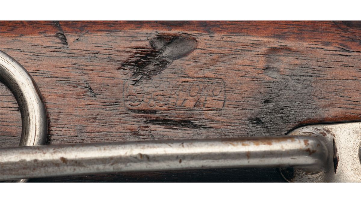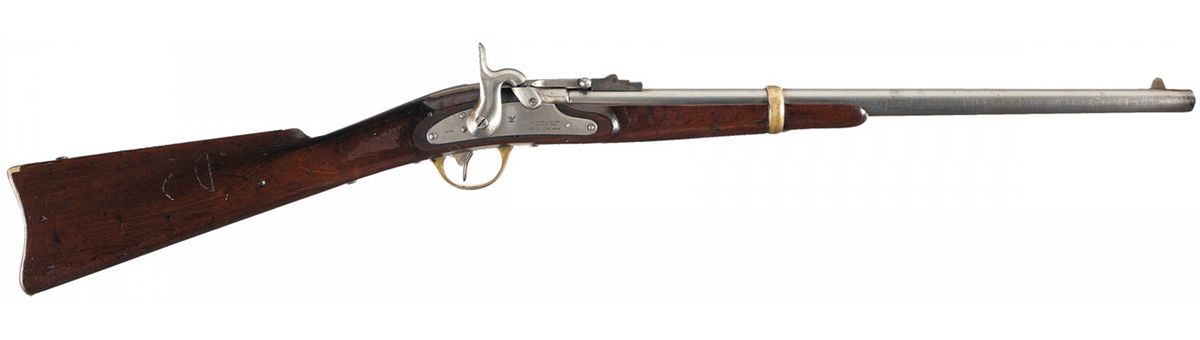 Blade front and 3-leaf rear sights, with the rear sight base doubling as the locking point for the breech lever, which has a 2-line patent marking. The lock plate features the Second Model markings "J.H.MERRILL BALTO/PAT JULY 1858/APL.9. MAY 21-28-61" under the bolster, "Eagle/shield" marked in front of the hammer and "1863" marked behind the hammer. The breech latch is marked with the Merrill name and patent date, along with the serial number. The single barrel band, trigger guard and "U.S." marked buttplate are brass. Straight grip stock with a saddle ring bar mounted to the left side flat and correctly without a patch box. The left side flat is stamped with a boxed "RKW" cartouche, and "TKL" initials stamped on the comb and barrel at breech, with many of the components stamped with the inspection initial "L".