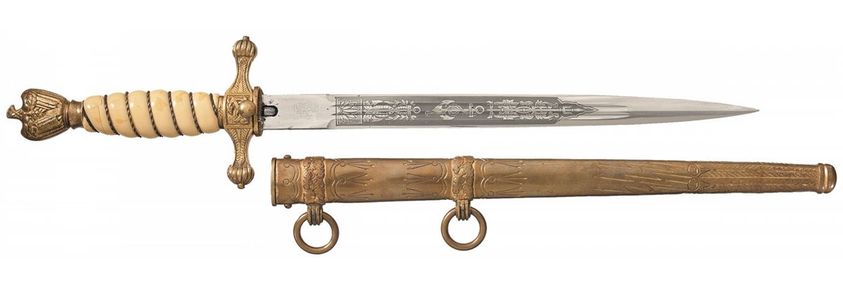 Blade is 9 7/8 inches long (15 overall), double fullered with etched naval decoration and the Eickhorn logo above the thumb catch. Gilt brass fittings, with a gold wire wrapped celluloid grip and Nazi eagle pommel. With a gilt finished engraved brass sheath.