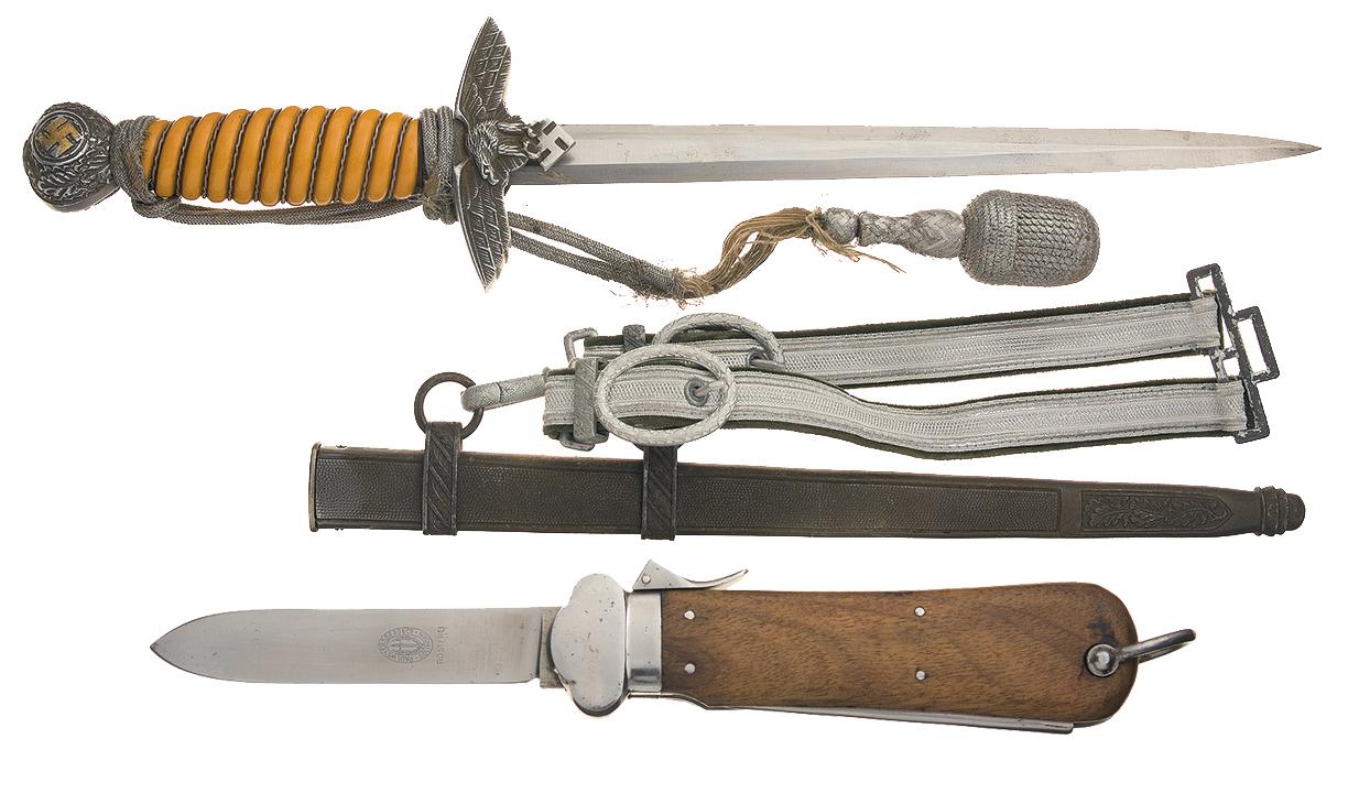 1) Eickhorn 2nd Pattern Luftwaffe dagger, 9 3/4" blade with makers mark, swooping eagle cross guard with oak leaf decoration, wire wrapped orange celluloid grip and oak leaf pommel with gold paint accent. With a oak leaf pattern sheath, silver portapee with matching solid acorn, and a green felt backed silver wire belt hanger with oval buckles. 2) Gravity knife, four inch blade marked with the Paul Weyersberg & Co logo on the left side above "ROSTFREI" (stainless steel). Smooth grip panels, with 3 3/4" folding spike. Both are very good to excellent, with fraying of the portapee on the dagger, dark color on the sheath, light spotting and pressure dents on the wood.