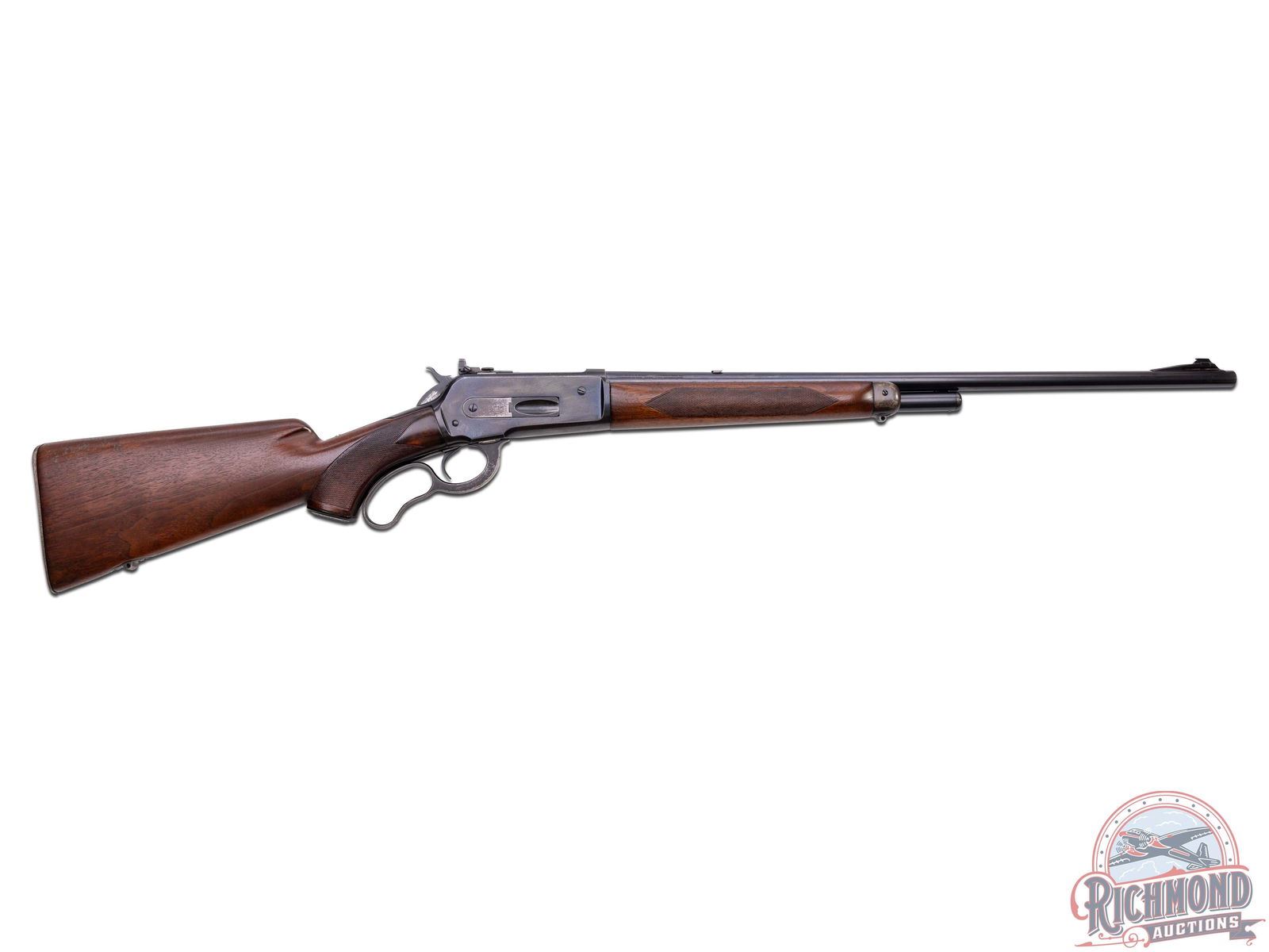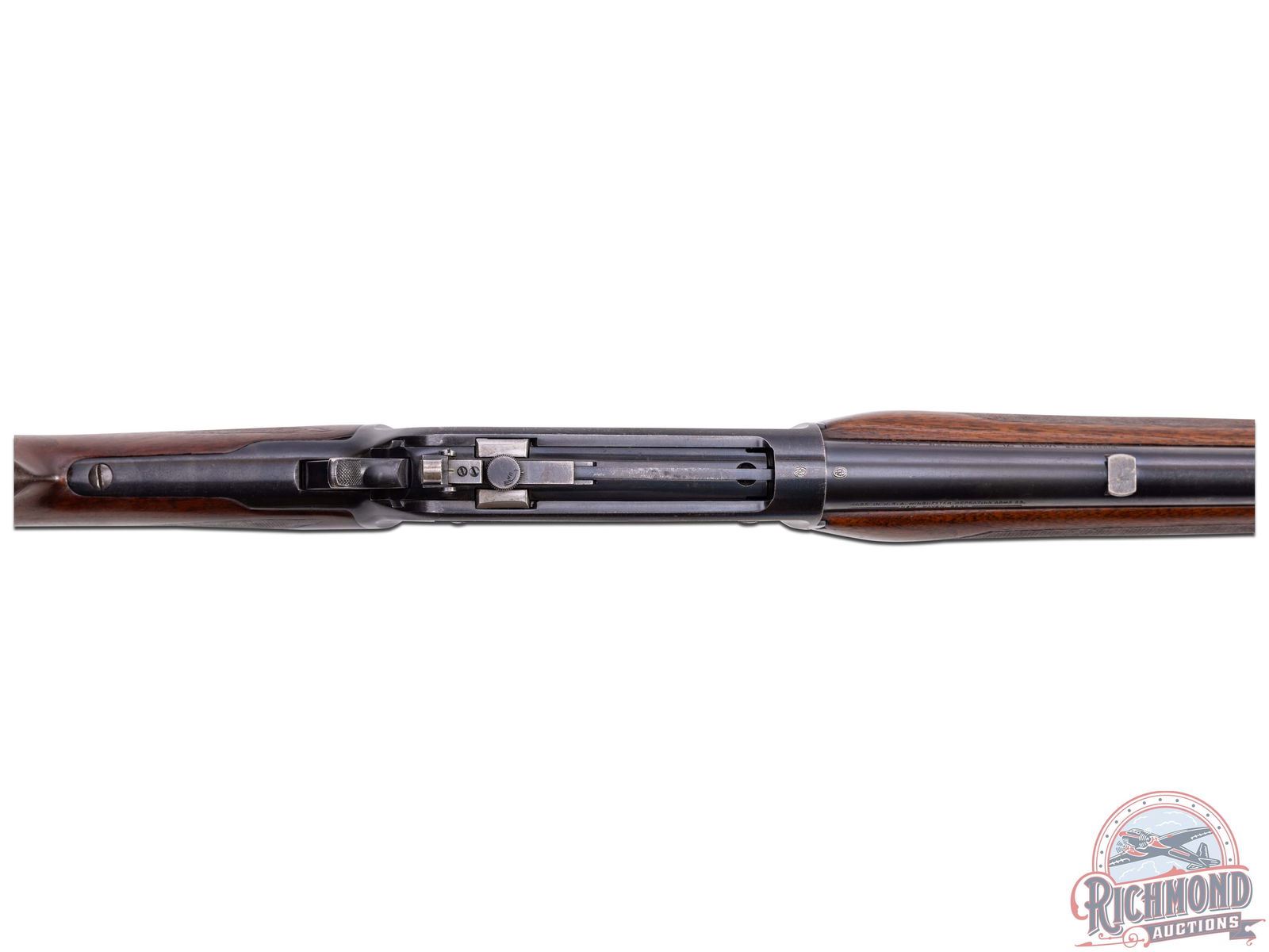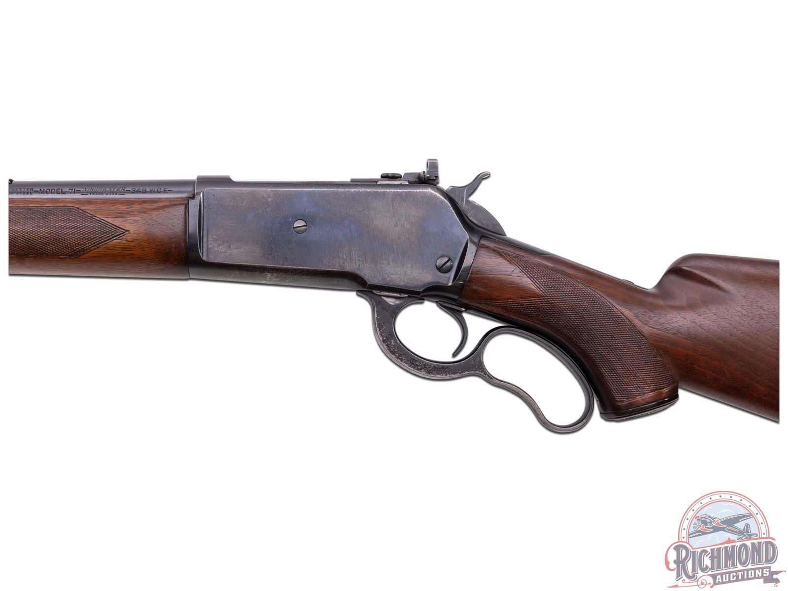 Made by Winchester Repeating Arms in 1936. 24" blued round Winchester Proof Steel barrel with hooded ramp front sight (missing hood), correctly plugged rear sight dovetail and action has desirable bolt peep sight. Barrel is marked with Winchester model and caliber on left and Winchester two line address on right with rifle in 348 caliber. Blued solid frame action with blued 2/3 magazine and plain trigger. Standard checkered walnut stocks with checkered steel butt plate and steel butt plate and sling swivel provisions (missing swivels). CALIBER: 348 W.C.F. S/N: 4890. FFL STATUS: Curio & Relic.