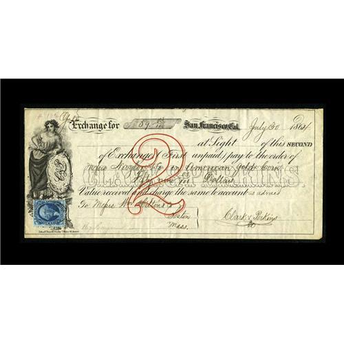 <B>Second of Exchange $59.03 July 30, 1864.</B></I> Payable in American gold coin and issued by Clark & Perkins of San Francisco. <B>Very Fine.</B></I>