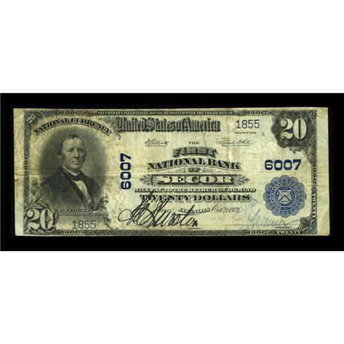 <B>Secor, IL</B></I> - $20 1902 Plain Back Fr. 660 <B>The First NB</B></I> Ch. # 6007<BR>A very scarce note from the only bank to issue in this Woodford County hamlet. The census stands at just five large notes, with this one of only two Plain Backs. <B>Fine-Very Fine,</B></I> with two color pen signatures.<BR><I>From The Lincoln Collection</B></I><BR><BR><b>Shipping:</b> Coins & Currency (<a target="_blank" href="http://www.heritageauctions.com/common/shipping.php">view shipping information</a>)