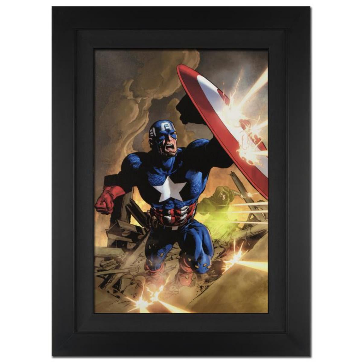 A piece of comic book history, this limited edition, from original art by Mike Deodato Jr., depicts a heroic Captain America. Brazilian artist Mike Deodato Jr. has become an enduring fan favorite, working in styles ranging from wildly energetic cartooning to moody photorealism. Deodato became one of the decade's most prolific and in-demand artists, including Marvel credits such as Avengers, Elektra, Incredible Hulk, Spider-Man and Thor. "Secret Avenger #12" is an extremely limited edition giclee on canvas by Mike Deodato Jr. presented by Marvel Comics, hand signed by the Great Stan Lee (1922-2018) and numbered out of only 10! This piece comes custom framed and ready to hang. Includes Certificate of Authenticity! Measures approx. 25" x 34" (with frame); 18" x 27" (image). Reference #: 203299.