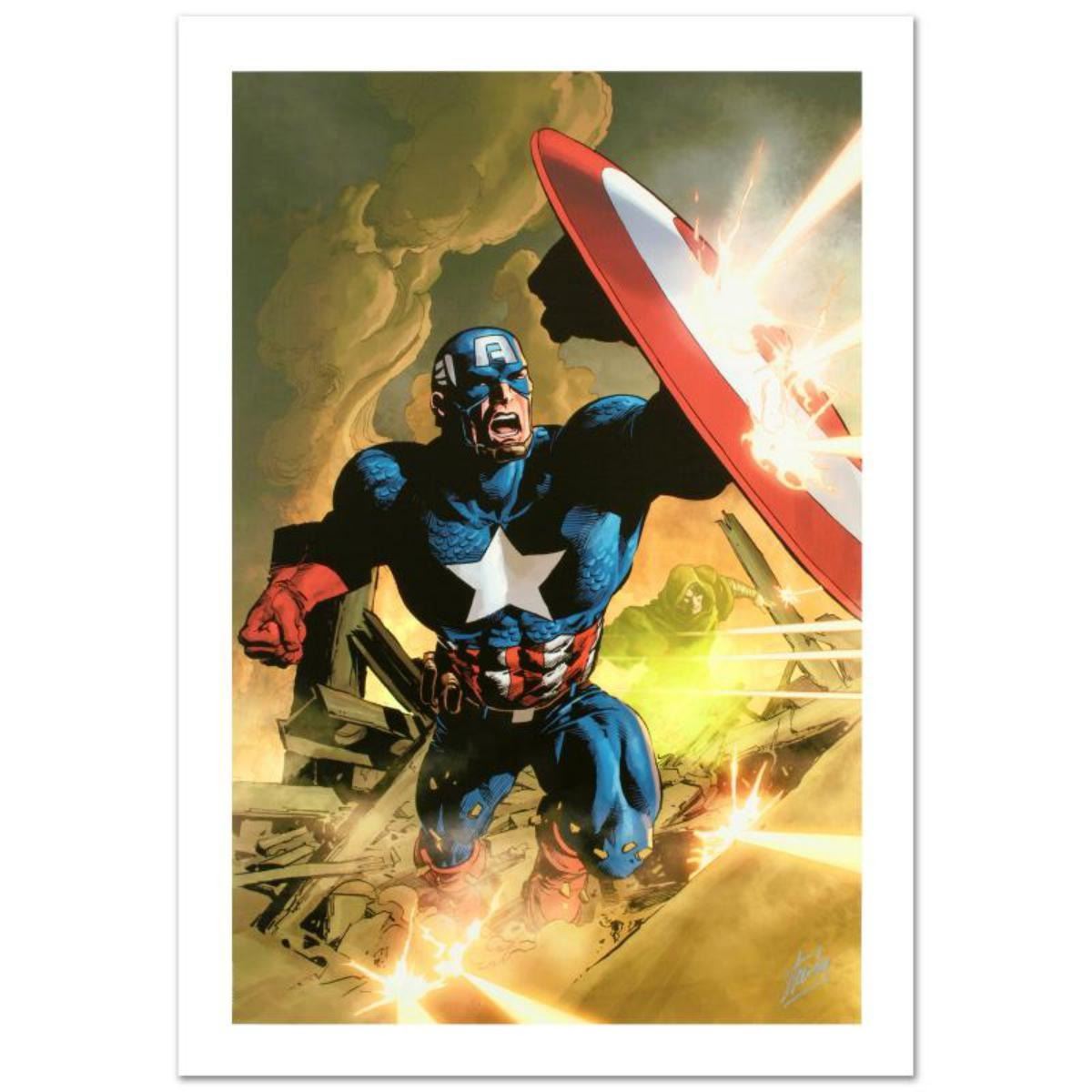 A piece of comic book history, this limited edition, from original art by Mike Deodato Jr., depicts a heroic Captain America. Brazilian artist Mike Deodato Jr. has become an enduring fan favorite, working in styles ranging from wildly energetic cartooning to moody photorealism. Deodato became one of the decade's most prolific and in-demand artists, including Marvel credits such as Avengers, Elektra, Incredible Hulk, Spider-Man and Thor. "Secret Avenger #12" is a limited edition giclee on canvas by Mike Deodato Jr. presented by Marvel Comics, numbered and hand signed by the Great Stan Lee (1922-2018)! Includes Certificate of Authenticity! Measures approx. 18" x 27" (image). Reference #: 186665.