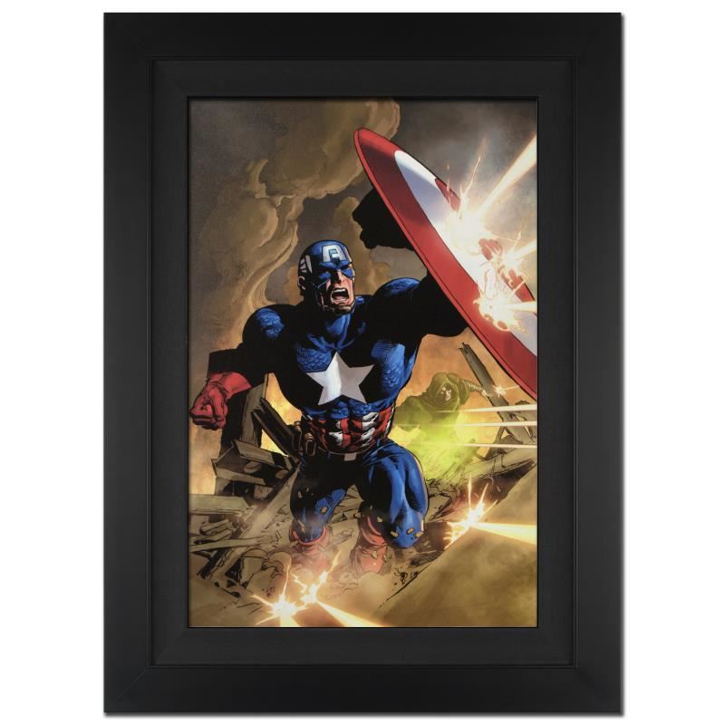 A piece of comic book history, this limited edition, from original art by Mike Deodato Jr., depicts a heroic Captain America. Brazilian artist Mike Deodato Jr. has become an enduring fan favorite, working in styles ranging from wildly energetic cartooning to moody photorealism. Deodato became one of the decade's most prolific and in-demand artists, including Marvel credits such as Avengers, Elektra, Incredible Hulk, Spider-Man and Thor. "Secret Avenger #12" is an extremely limited edition giclee on canvas by Mike Deodato Jr. presented by Marvel Comics, hand signed by the great Stan Lee and numbered out of only 10! This piece comes custom framed and ready to hang. Includes Certificate of Authenticity! Measures approx. 25" x 34" (with frame); 18" x 27" (image).
