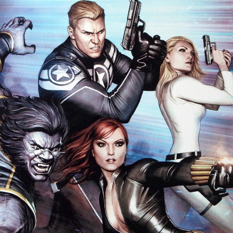 A piece of comic book history, this limited edition, from original art by Adi Granov, depicts heroic characters from the Marvel Universe. While working for Marvel, Adi Granov has drawn covers for Spider-Man, X-Men, and the Fantastic Four. Granov also helped design the Iron Man suit for the recent film adaptation. "Secret Avengers #13" is a limited edition numbered giclee on canvas by Adi Granov presented by Marvel Comics. This piece comes gallery wrapped! Includes Certificate of Authenticity! Measure approx. 18" x 27"(image).