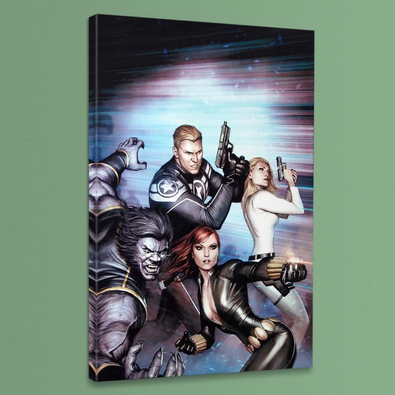 A piece of comic book history, this limited edition, from original art by Adi Granov, depicts heroic characters from the Marvel Universe. While working for Marvel, Adi Granov has drawn covers for Spider-Man, X-Men, and the Fantastic Four. Granov also helped design the Iron Man suit for the recent film adaptation. "Secret Avengers #13" is a limited edition numbered giclee on canvas by Adi Granov presented by Marvel Comics. This piece comes gallery wrapped! Includes Certificate of Authenticity! Measure approx. 18" x 27"(image).