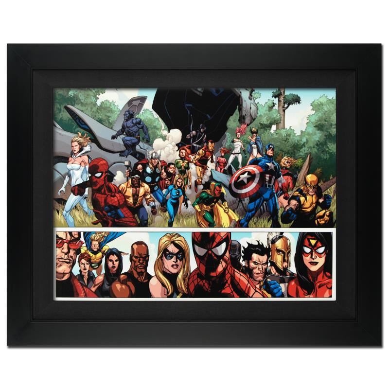 A piece of comic book history, this limited edition, from original art by Leinil Francis Yu, depicts characters from the marvel universe. After winning the Wizard's Drawing Board Contest, Marvel Comics hired Leinil Francis Yu to work on the Wolverine series. After his run on Wolverine, he moved on to work on Marvel's core X-Men title in 2000. Yu continued to work on other Marvel titles such as Fantastic Four, Ultimate Wolverine vs. Hulk and New Avengers. "Secret Invasion #1" is an extremely limited edition giclee on canvas by Leinil Francis Yu presented by Marvel Comics, hand signed by the Great Stan Lee (1922-2018) and numbered out of only 10! This piece is custom framed and ready to hang. This piece is custom framed and ready to hang. Includes Certificate of Authenticity! Measures approx. 31" x 25" (with frame), 24" x 18" (image).