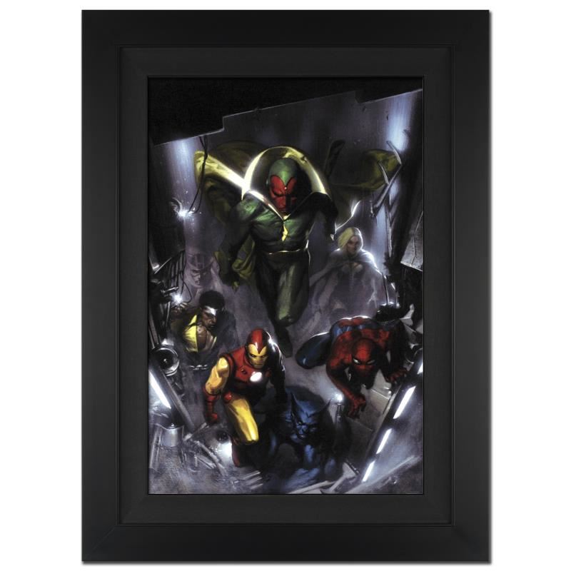 A piece of comic book history, this limited edition, from original art by Gabriele Dell'Otto, depicts Iron Man and Spider-Man. In 1998 Dell'Otto started collaborating with the European division of Marvel Comics, producing covers, posters and lithographies for Italy, France and Germany. In 2002, his work was shown to the editor-in-chief of Marvel Comics, who entrusted to him with the art for the Secret War mini-series. "Secret Invasion #2" is an extremely limited edition giclee on canvas by Gabriele Dell'Otto presented by Marvel Comics, hand signed by the great Stan Lee and numbered out of only 10! This piece comes custom framed and ready to hang. Includes Certificate of Authenticity! Measures approx. 25" x 34" (with frame), 18" x 27" (image).