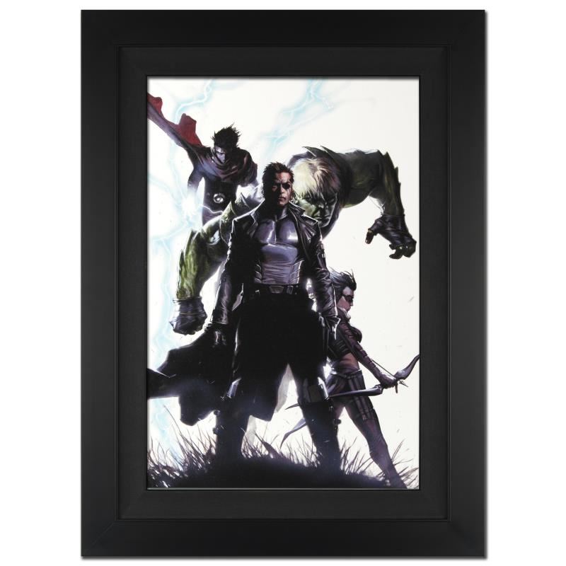 A piece of comic book history, this limited edition, from original art by Gabriele Dell'Otto, depicts the heroic Nick Fury, Wiccan, and Hulkling. In 1998 Dell'Otto started collaborating with the European division of Marvel Comics, producing covers, posters and lithographies for Italy, France and Germany. In 2002, his work was shown to the editor-in-chief of Marvel Comics, who entrusted to him with the art for the Secret War mini-series. "Secret Invasion #4" is an extremely limited edition giclee on canvas by Gabriele Dell'Otto presented by Marvel Comics, hand signed by the great Stan Lee and numbered out of only 4! This piece comes custom framed and ready to hang. Includes Certificate of Authenticity! Measures approx. 29" x 40" (with frame); 22" x 33" (image).