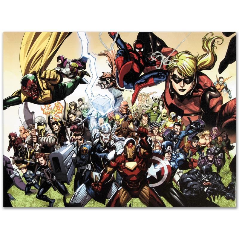 A piece of comic book history, this limited edition, from original art by Leinil Francis Yu, depicts Spider-Man, Thor, Iron Man, Nick Fury, Captain America, Venom, Vision, and Stature among many other characters from the marvel universe. After winning the Wizard's Drawing Board Contest, Marvel Comics hired Leinil Francis Yu to work on the Wolverine series. After his run on Wolverine, he moved on to work on Marvel's core X-Men title in 2000. Yu continued to work on other Marvel titles such as Fantastic Four, Ultimate Wolverine vs. Hulk and New Avengers. "Secret Invasion #6" is a limited edition numbered giclee on stretched canvas by Leinil Francis Yu presented by Marvel Comics. This piece comes gallery wrapped. Includes Certificate of Authenticity! Measures approx. 24" x 18" (image); 1.5" (depth). This item requires special handling and may have a longer than usual turnaround.