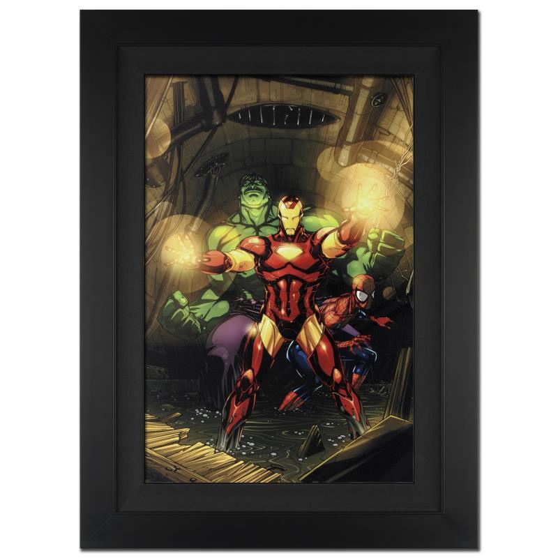 A piece of comic book history, this limited edition, from original art by Leinil Francis Yu, depicts the classic characters The Hulk, Spider-Man, and Iron Man. After winning the Wizard's Drawing Board Contest, Marvel Comics hired Leinil Francis Yu to work on the Wolverine series. After his run on Wolverine, he moved on to work on Marvel's core X-Men title in 2000. Yu continued to work on other Marvel titles such as Fantastic Four, Ultimate Wolverine vs. Hulk and New Avengers. "Secret Invasion #7" is an extremely limited edition numbered giclee on canvas by Leinil Francis Yu presented by Marvel Comics, hand signed by the great Stan Lee and numbered out of only 4! This piece comes custom framed and ready to hang. Includes Certificate of Authenticity! Measures approx. 29" x 40" (with frame), 22" x 33" (image).