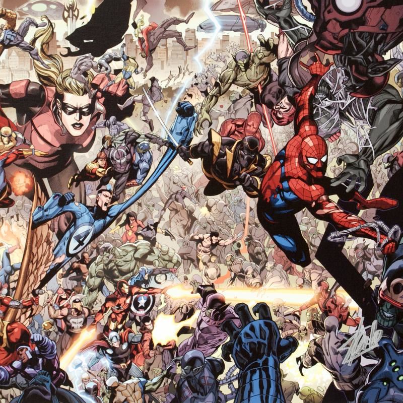 A piece of comic book history, this limited edition, from original art by Leinil Francis Yu, depicts classic characters such as Spider-Man, Ronin, Stature, Mr. Fantastic, and many others. After winning the Wizard's Drawing Board Contest, Marvel Comics hired Leinil Francis Yu to work on the Wolverine series. After his run on Wolverine, he moved on to work on Marvel's core X-Men title in 2000. Yu continued to work on other Marvel titles such as Fantastic Four, Ultimate Wolverine vs. Hulk and New Avengers. "Secret Invasion #7" is a limited edition giclee on canvas by Leinil Francis Yu presented by Marvel Comics, numbered and hand signed by the great Stan Lee! Includes Certificate of Authenticity! Measure approx. 24" x 18" (image).